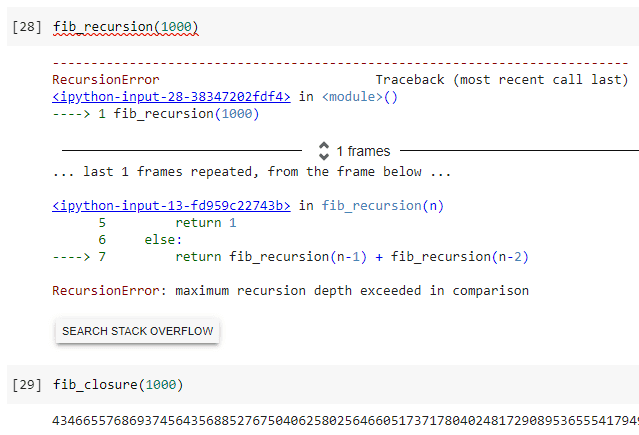 Đó quả là một con số khổng lồ, nhưng phương thức closure có thể kết thúc việc tính toán trong khoảng 100µs, trong khi hàm đệ qui gặp phải hạn chế của nó.