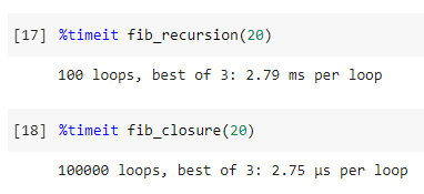 2.79ms v.s. 2.75µs. Phương pháp closure nhanh hơn 1000 lần so với đệ qui! Lí do trực quan nhất là tất cả các giá trị tạm thời của hàm đệ qui được lưu trữ riêng biệt, nhưng closure thật sự cập nhật các biến giống nhau trong mỗi lần lặp.