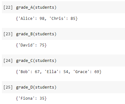 Code trên sẽ cho chúng ta 4 hàm, cái đó sẽ phân loại học sinh thành các lớp xếp loại tương ứng dựa trên ranh giới chúng ta đã cho. Xin lưu ý rằng, chúng ta có thể thay đổi cận tạo mọi thời điểm để tạo hàm khác nhau hoặc khi đề các hàm xếp loại hiện tại.